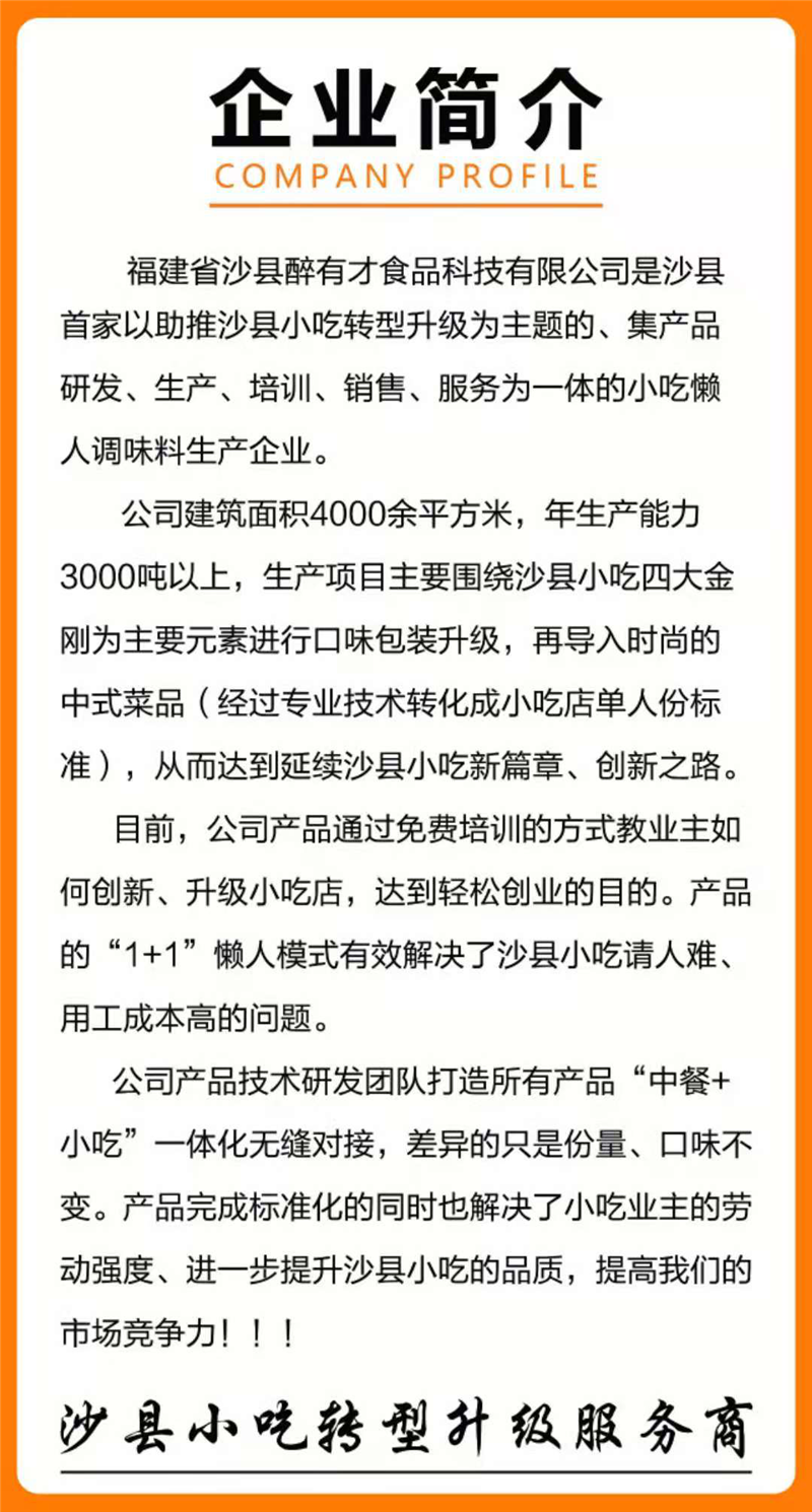 沙县醉有才食品科技有限公司是沙县首家以助推沙县小吃转型升级为主题的、集产品研发、生产、培训、销售、服务为一体的小吃懒人调味料生产企业,目前已自主研发酱料40多款。YABO.COM与醉有才公司本着优势互补、资源共享、共同发展的原则,以传承、创新“沙县小吃”技艺和推进“沙县小吃”转型升级为目标,从技术研发和培训推广两个方面对接合作。