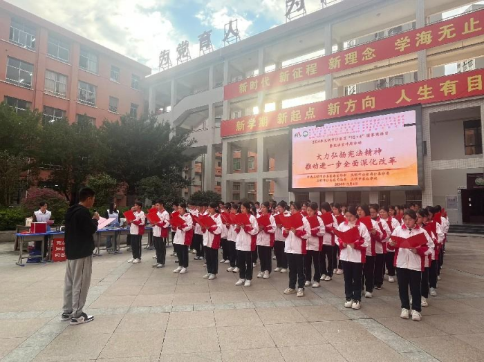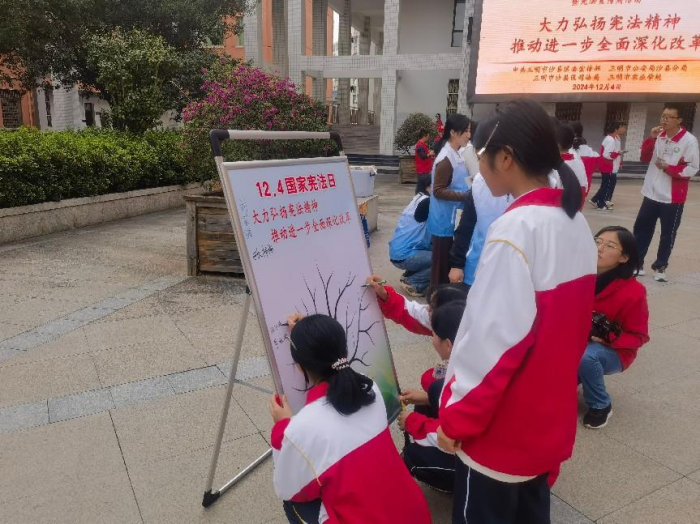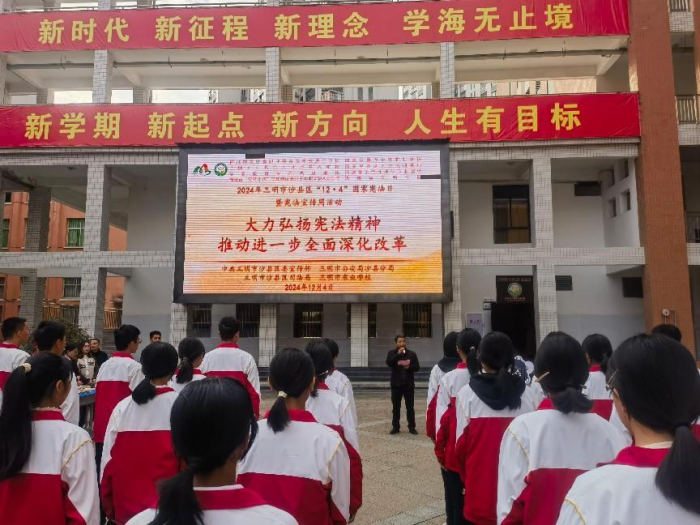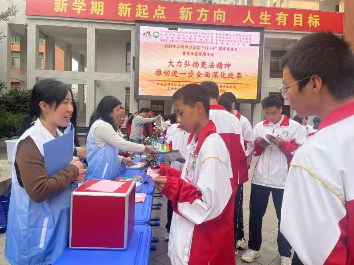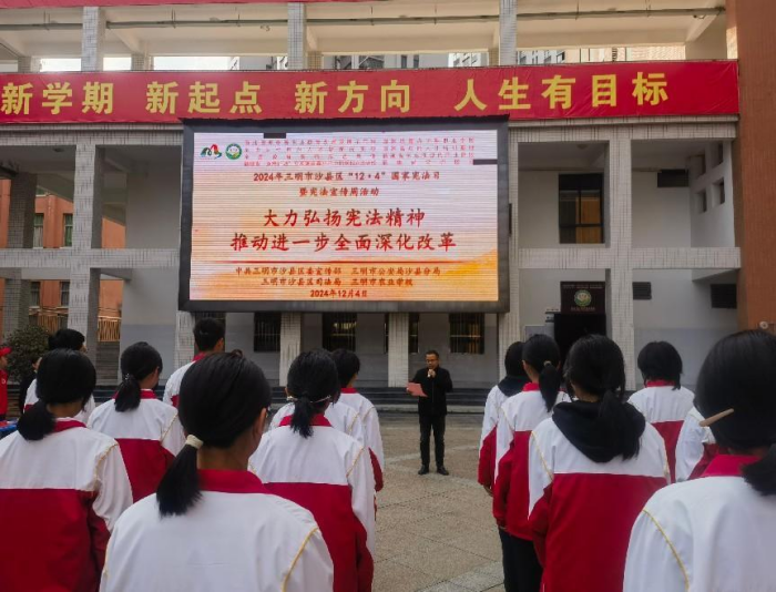 2024年12月4日是第十一个国家宪法日,为弘扬宪法精神,普及宪法知识,加强校园法治文化阵地建设,引领青少年成为宪法的忠实崇尚者、自觉遵守者和坚定捍卫者,12月4日下午,中共三明市沙县区委宣传部、三明市公安局沙县分局、三明市沙县区司法局与我校联合开展“宪法宣传周”主题活动。中共三明市沙县区委宣传部副部长、社科联主席马建明受邀参加活动,活动由学校副校长陈文优主持。