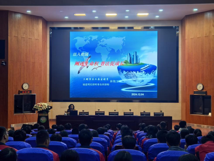 林艳玉女士是三明市关工委德育报告团成员,原市委党校教务处主任、副教授,福建明经律师事务所律师。她法学理论功底深厚,实践经验丰富。她以“阐释生命权,普法促成长”为主题,为我校学生带来了一场内容详实、意义深远的法治教育讲座。